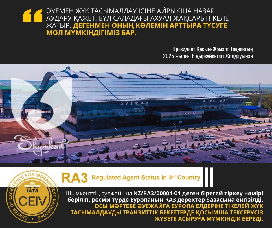 Сонымен қатар, әуемен жүк тасымалдау саласына ерекше көңіл бөлінуде. Президент Тоқаевтың Жолдауында бұл саладағы ахуалдың жақсарып келе жатқаны және оның көлемін арттыруға мол мүмкіндік бар екені атап өтілді. Шымкенттің әуежайына KZ/RA3/00004-01 бірегей тіркеу нөмірі беріліп, ресми түрде Еуропаның RA3 деректер базасына енгізілді. Бұл мәртебе әуежайға Еуропа елдеріне тікелей жүк тасымалдауды транзиттік бекеттерде қосымша тексерусіз жүзеге асыруға мүмкіндік береді.