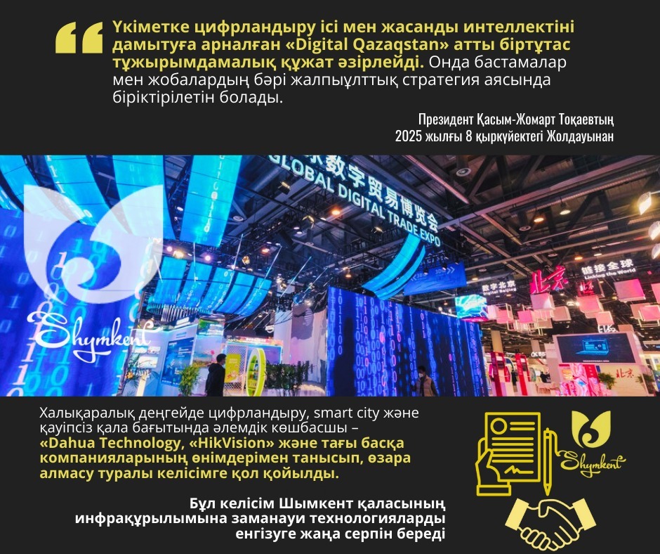 Шымкент қаласы халықаралық деңгейде «Dahua Technology», «HikVision» және басқа да smart city, қауіпсіздік және цифрландыру саласындағы жетекші компаниялармен өзара тәжірибе алмасу туралы келісімдерге қол қойды. Бұл келісім қала инфрақұрылымына жаңа технологияларды енгізуге серпін береді.