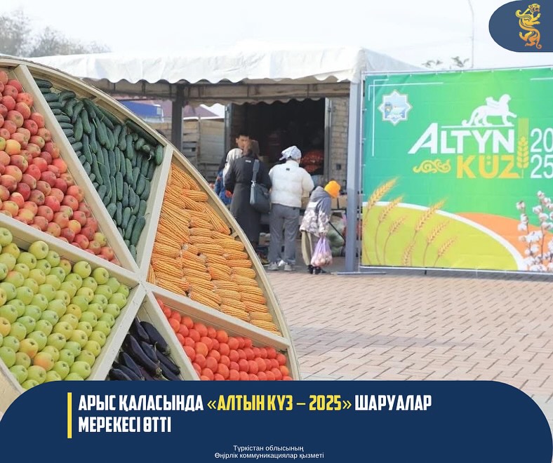 Арыс қаласында дәстүрлі «Алтын күз – 2025» мерекесі ұйымдастырылып, ауыл шаруашылығы өнімдерінің жәрмеңкесі өтті. Шараға қала әкімі Қайсар Маңқараев арнайы қатысып, диқандар мен малшылардың жыл бойғы еңбегінің нәтижесімен танысты.
