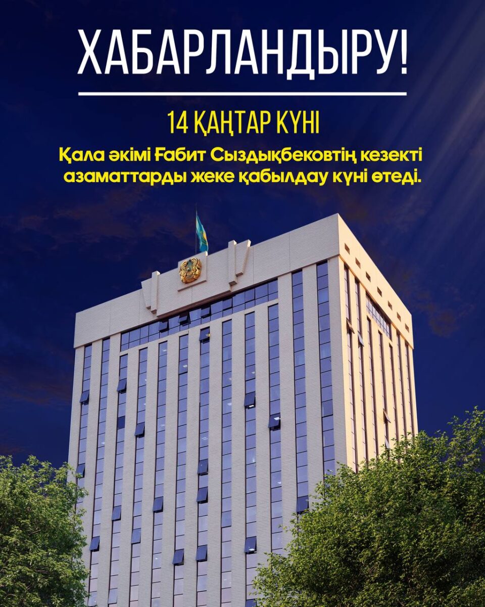 Қала әкімі Ғабит Сыздықбековтің кезекті азаматтарды жеке қабылдау күні өтеді. Қабылдау әкімдіктің фронт-офисіне келіп, арнайы жазылған тұрғындардың тізімі бойынша жүргізіледі.
